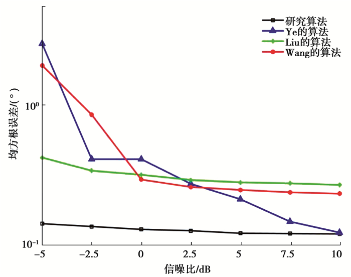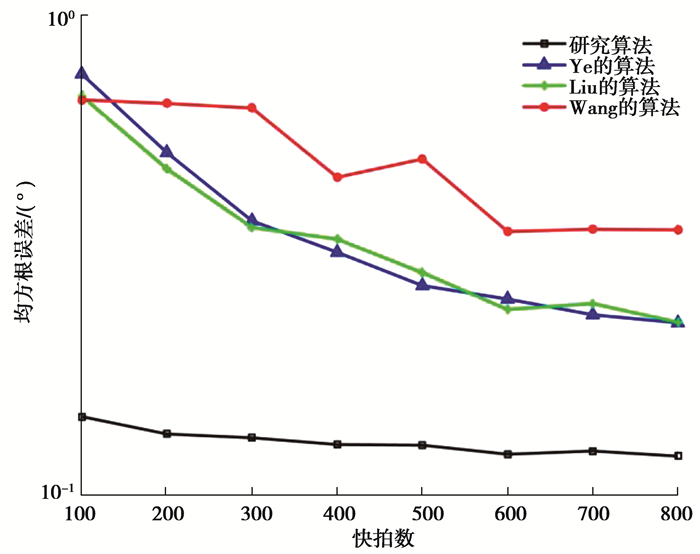 第二组仿真实验对比4种不同算法对角度估计的精确度。此次实验是在信号能被分辨开的情况下进行对比,所以信号源的数量减少到3个,方向角设为30°,40°,50°。首先将快拍数固定在500。图 5显示4个算法的均方根误差随信噪比的变化情况。然后将信噪比固定在2.5 dB,图 6显示4个算法的均方根误差随快拍数的变化情况。从这2幅对比图中可以发现,算法的估计精确度要远超过其他3种算法。另外,从图 5中可以发现当信噪比较低的时候,算法的优势更加明显。而从图 6中也可以发现算法即使在较低的快拍数下也能获得较好的估计性能。综合2组仿真实验的结果,算法无论是在估计精确度方面,还是对角度的分辨力方面都会优于已有的几种自校正DOA估计算法。