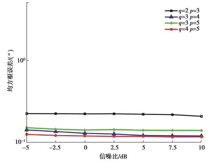 图 7 不同q, p下均方根误差随信噪比的变化曲线 Fig. 7 RMSE of proposed method versus SNR for different q and p |