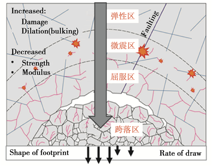 1 Cavehoek本构模型理论Cavehoek本构模型是美国Itasca公司于2010年开发的[10],主要应用于煤矿长壁开采和采空区发展的三维计算[11-13]。Duplancic[14]通过波速法对帕克斯的矿区围岩进行了调查,发现煤层开挖后围岩的应力状态主要可分为4个区域:垮落区、屈服区、微震区、弹性区,如图 1所示。