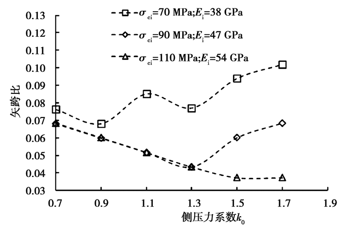 图 10为不同强度弱风化晶屑凝灰岩在不同侧压力系数下60 m大跨度洞室最小矢跨比计算结果,由图可知,侧压力系数从0.7~1.7对60 m洞室最小矢跨比影响较小,岩石强度不同,最小矢跨比在不同侧压力系数下所表现出的规律也不一样;在岩石强度为高值时,最小矢跨比随着侧压力系数的增大而减小;当岩石强度为中值时,最小矢跨比随着侧压力系数的增大先减小后增大;当岩石强度取低值时,最小矢跨比随着侧压力系数的增大表现为以增长为主的趋势;对于当下的埋深和岩石条件,侧压力系数为0.7~1.7时,60 m大跨度洞室最小矢跨比的范围为0.04~0.1。主要原因是不同岩石条件和不同应力状态下,所达到的拱效应不一样,侧压力系数越高,岩体条件越好,越有利于拱效应的形成,但岩体条件越差,较高的侧压力系数反而不利于拱效应的形成。