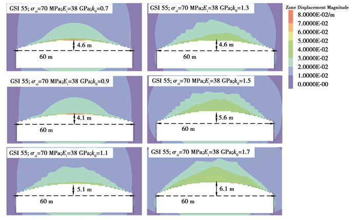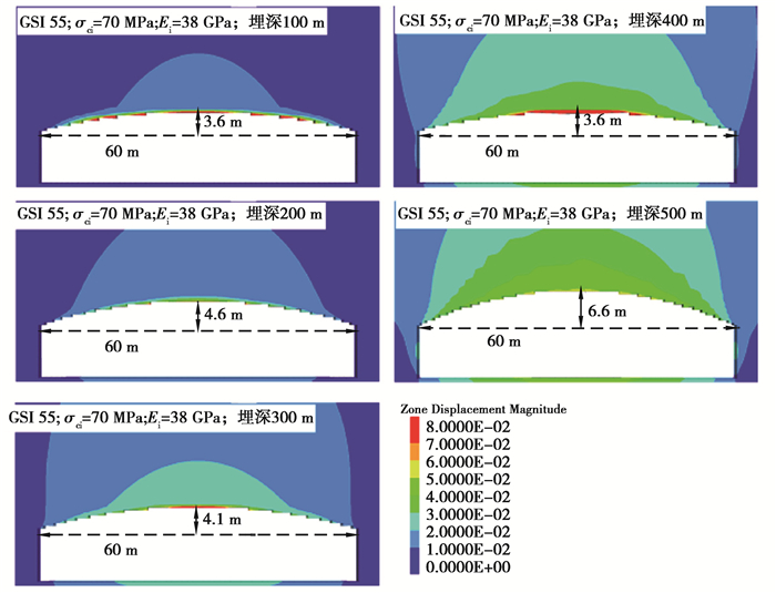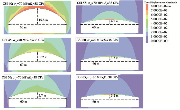 图 7给出了弱风化晶屑凝灰岩下限值时不同GSI下洞室最小矢跨比计算结果,由图可知,虽然GSI大于或等于60时,对60 m大跨度洞室的最小矢跨比的影响较小,但对洞室整体的变形仍然有影响,GSI越大,洞室变形越小。