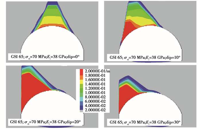 在结构面对矢跨比的影响分析中发现,某些情况下即使应变小于极限应变标准值,但洞室整体变形范围较大,即扰动范围较大,这种现象不利于大跨度洞室的稳。如图 12所示,图中几种情况的应变均未超过极限应变标准值,但扰动范围大,这种情况是不能安全成拱的,因此在结构面对最小矢跨比研究中,大跨度洞室的安全不能仅仅从极限应变标准来,还应当根据具体计算结果来判断是否是结构面主导的问题。