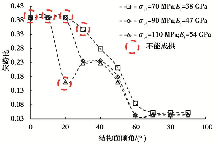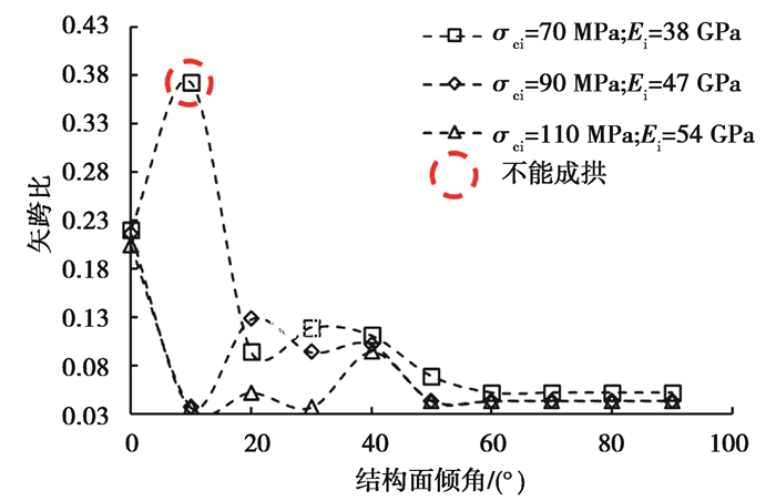 根据上述原则,对两种强度的结构面在不同倾角下的60 m大跨度洞室最小矢跨比进行了统计(图中红色圆圈标记表示不能成拱),如图 14和图 15所示。从图中可知,结构面参数取低值时,结构面的倾角对大跨度洞室成拱起关键作用,倾角为0°~30°时,虽然应变满足条件,但仍然安全裕度较低,不能成拱;结构面参数取高值时,结构面的影响相对减小,在岩石强度较小时,缓倾结构面对洞室稳定性影响较大;缓倾结构面对大跨度洞室稳定影响非常大,结构面的倾角越大,越有利于大跨度洞室的稳定,最小矢跨比随着倾角的增大呈减小趋势。