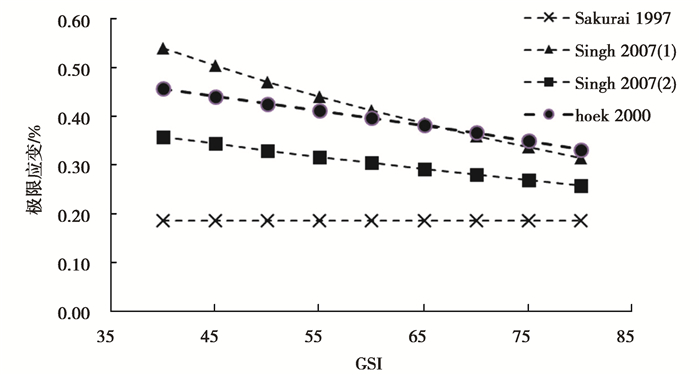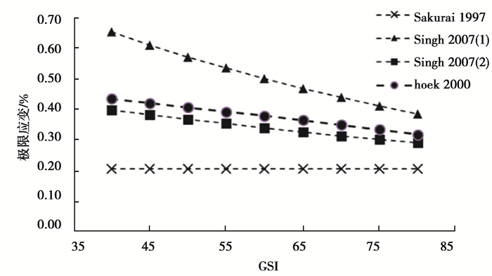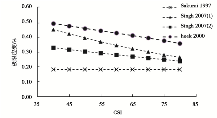 图 3 UCS=90 MPa,Ei=47.0 GPa时各GSI下的极限应变 Fig. 3 When UCS=90 MPa, Ei=47.0 GPa, the limit strain under each GSI |