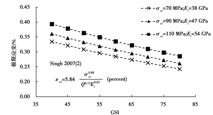 | $ {{\varepsilon _{{\rm{cr}}}} = 31.1\frac{{\sigma _{{\rm{ci}}}^{1.6}}}{{{E_i}{\gamma ^{0.6}}Q0.2}}({\rm{ percent }}),} $ | (11) |