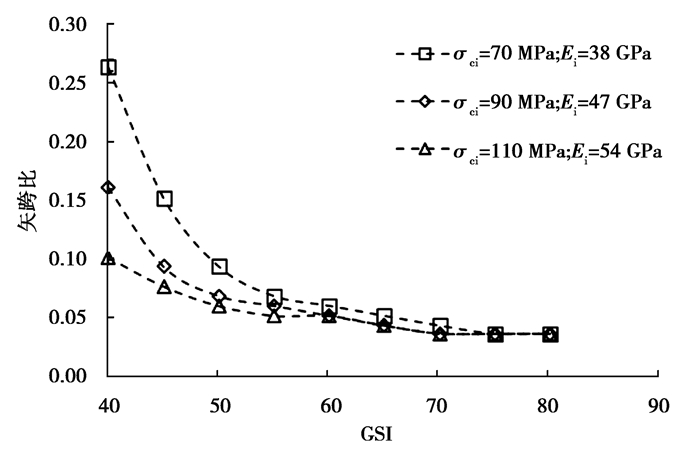 图 6为不同强度弱风化晶屑凝灰岩在不同GSI下60 m大跨度洞室最小矢跨比计算结果,由图可知,在不同岩石强度下,GSI对60 m大跨度洞室最小矢跨比的影响是不同的,岩石强度越低,GSI的影响越大,岩石强度越高,GSI的影响越小;GSI对60 m大跨度洞室最小矢跨比的影响主要在GSI取40~55之间,当GSI大于或等于60时,GSI的改变对最小矢跨比的影响较小;当前岩体条件下,60 m大跨度洞室的矢跨比为0.04~0.26。
