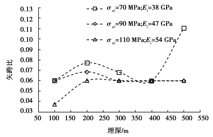 图 8 不同强度弱风化晶屑凝灰岩在不同埋深时的最小矢跨比 Fig. 8 The minimum sagittal span ratio of slightly weathered crystal tuff with different strength at different burial depths |