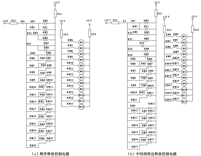 在图 2(b)中,右侧电路为从中间到两边的控制电磁铁磁性的释放一次回路图,即从中间到两边控制释放电路的执行电路图;左侧电路为从中间到两边的控制电磁铁磁性的释放二次回路图,即从中间到两边控制释放电路的控制电路图。