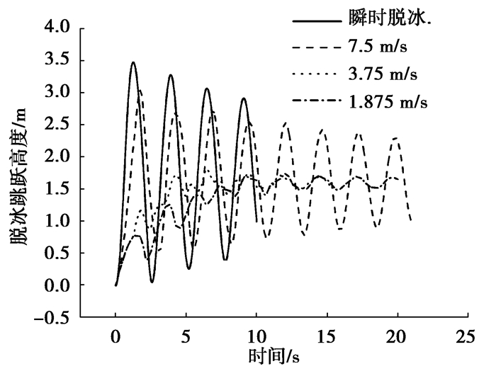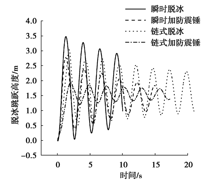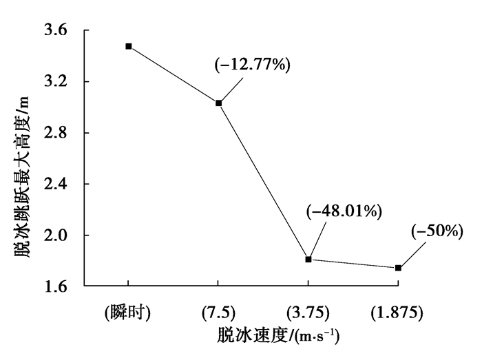1) 瞬时脱冰在不同脱冰速度为最不利情况,随着脱冰速度的降低,脱冰跳跃最大高度降低,脱冰跳跃最大高度与瞬时脱冰跳跃高度相比最终趋于降低50%左右。