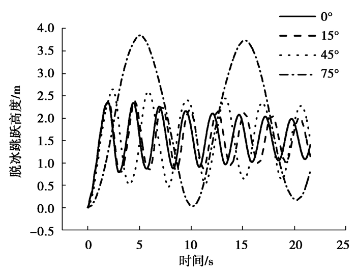 从图 6可知,在不同倾角高差下,随着高差倾角的增大,脱冰跳跃的最大跳跃位移一直在增大,脱冰振动的时程曲线频率在一直降低。不同倾角高差下脱冰跳跃的最大高度进行分析如图 7。图 7表明,得到脱冰跳跃最大高度随着不同倾角高差的增大而非线性增加,当倾斜角度达到75°时,脱冰跳跃最大高度比没有高差时增大了64.16%。这就给实际工况中设计不同高差输电线路提供了理论支撑,特别是在山地上建立的大跨度大高差的输电线路,要充分考虑这个因素,做好防振减振措施,避免不必要的事故发生。