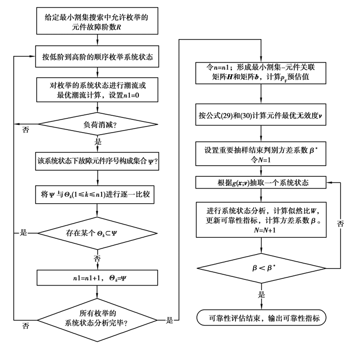 3 基于参数解析寻优的重要抽样算法流程基于参数解析优化,即基于最小割集辨识和最小二乘估计实现v的优化求取,然后采用重要抽样进行电网可靠性的仿真计算,整个过程分为2个环节:1)参数优化环节:搜寻n个Θk (1≤k≤n)并建立式(24)~(26),由式(30)得到IS-PDF的参数v;2)主抽样环节:以g(x; v)为抽样函数,随机抽取N个系统状态,并判断每个系统状态是否失负荷以及负荷削减量,更新可靠性指标统计量。流程图见图 2,详细步骤如下。