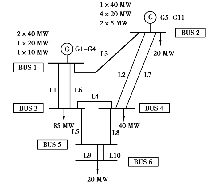 RBTS [19]可靠性测试系统由于所含元件较少,有利于对各种不同方法的应用效果进行直观比较,但该系统不符合N-1确定性可靠性准则,为此在该系统的节点5和6之间增加一条输电线路L10,并将改变后的系统称为MRBTS可靠性测试系统,见图 3。负荷采用年峰荷模型,基于以下4种方法进行电网可靠性评估,其中方法1~3的收敛条件为EENS指标的方差系数β*=0.01。
