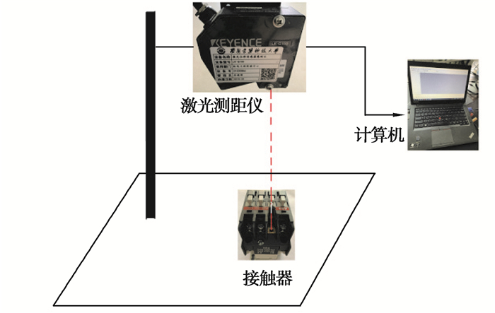 本实验依托ABB江门公司实验平台,对优化后的模型进行验证。首先,将优化后的模型参数按1 ∶1进行实际生产,其生产过程中,触头所用材料为AgNi15,触桥所用材料为CuZn15,铁芯所用材料为50W600。为了精确测量并标记触头弹跳过程的动触头位移变化,使用Ke-Yence的LK-G150型激光位移器对上述电磁接触器的一组触头进行实验。激光位移器能够实现位移数据的实时采集。为了充分掌握接触器运行时的状态,激光位移器需一直处于实时监测状态。在测试过程中,让其位移传感器放置在接触器的正上方,感测头垂直对准该主触头进行零点标记。平台主要布置如图 10所示。
