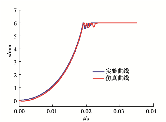 实验所得的数据由电脑直接记录,将Excel表格数据导入到MATLAB中进行1.2准则坏点剔除、间隔取样值和散点函数曲线拟合。将标定取得的触头弹跳过程位移曲线与仿真得到的曲线进行对比,结果如图 11所示。