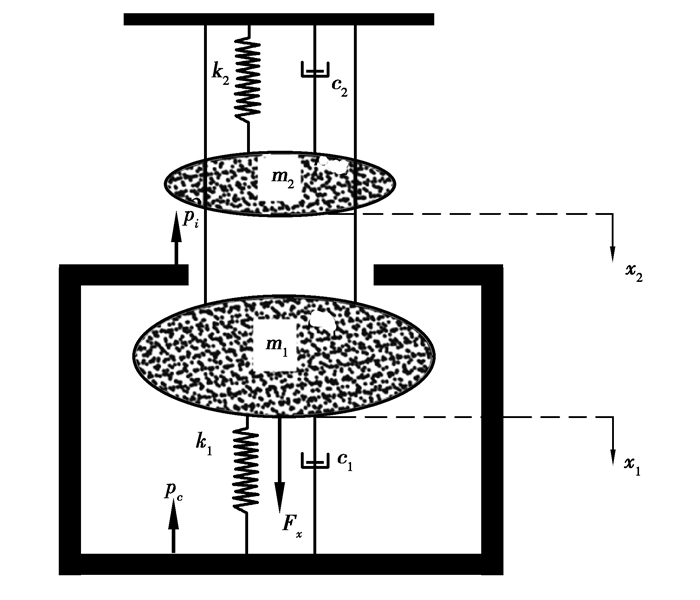 | $ \left.\begin{array}{l} m_{1} \ddot{x}_{1}+c_{1} \dot{x}_{1}+c_{2}\left(\dot{x}_{1}-\dot{x}_{2}\right)+k_{1} x_{1}+k_{2}\left(x_{1}-x_{2}\right)=F_{x}-P_{c}, \\ m_{2} \ddot{x}_{2}+c_{2}\left(\dot{x}_{2}-\dot{x}_{1}\right)+k_{2}\left(x_{2}-x_{1}\right)=-P_{i}。\end{array}\right\} $ | (1) |