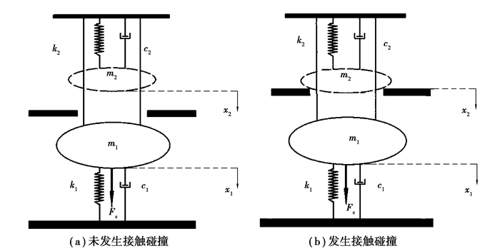 触头弹跳引起的机械振动现象存在于交流接触器整个工作过程中,由于动、静触头以及动、静铁芯间的碰撞接触均具有间断特征,使交流接触器的动力学特性出现不连续性现象。其运动模型如图 2所示。