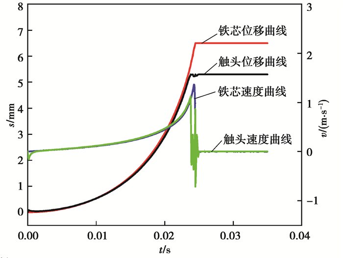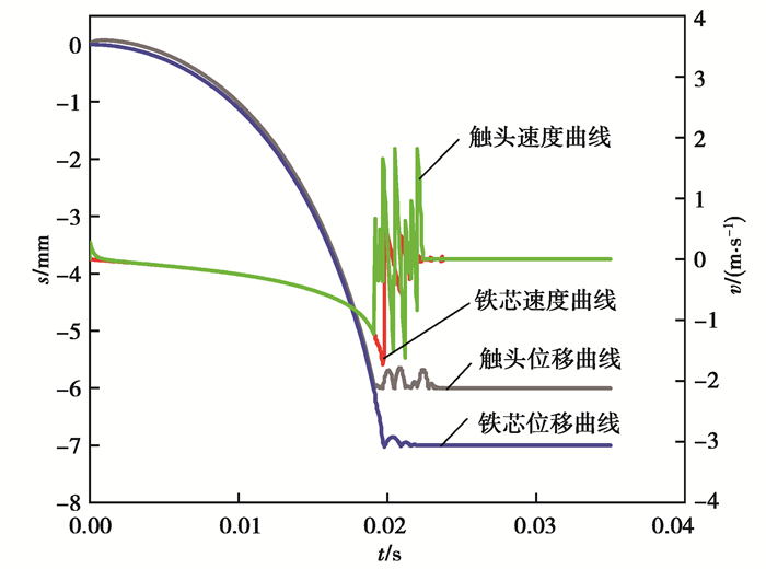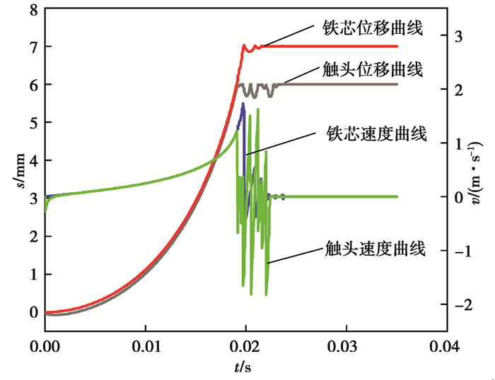 求解结果如图 4所示。从图 4可知,动触头从开始移动到发生初次碰撞的时间为0.019 0 s,其碰撞瞬间速度为1.293 m/s,在0.021 9 s时达到稳定合闸状态;动铁芯在0.019 7 s发生初次碰撞,其碰撞瞬间速度为1.687 mm/s,在0.021 1 s时达到稳定接触。对比可知:动触头开始弹跳时间早于动铁芯,这是由于动静触头距离小于动静铁芯距离,导致动触头先于动铁芯发生撞击和弹跳。