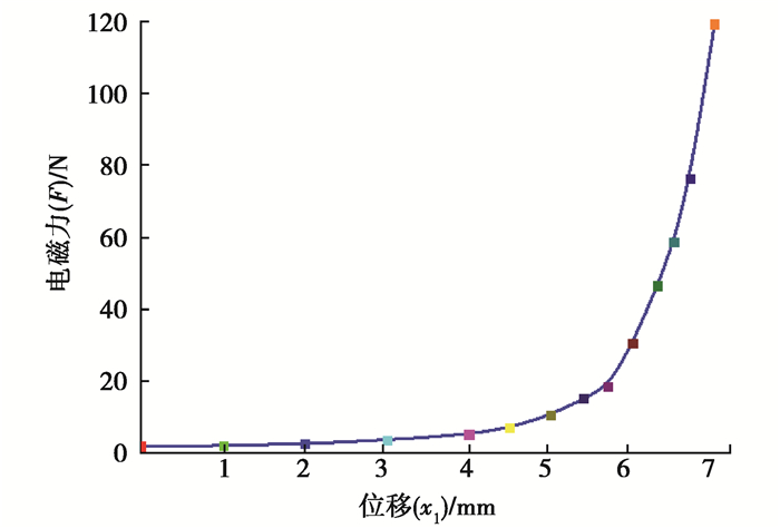 利用多物理场分析软件ANSYS,对动静铁芯间的电磁力进行仿真计算。有限元仿真分析遵循静态电磁场原理,不存在时变效应。通过对物体表面的麦克斯韦电磁应力张量进行表面积分,可获得静态场条件下作用在物体上的电磁力。ANSYS有限元分析软件建立了交流接触器有限元模型,然后利用SOURC36单元创建了3D跑道型线圈,线圈匝数设置为1 600闸,施加了磁力线边界条件,仿真得到的电磁力曲线如图 5所示。