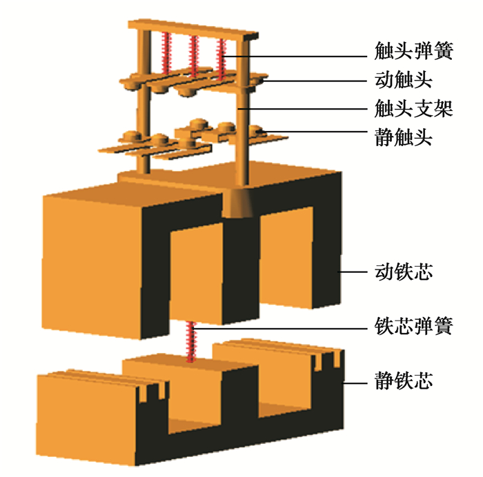1 接触器触头模型建立与规律分析交流接触器由触头系统、电磁系统和触头支架3部分组成(见图 1)。接触器工作时,先给电磁线圈通电,当电磁力大于反力弹簧作用力时,动铁芯通过触头支架使动触头向下运动,由于动静触头间距小于动静铁芯间距,使得动触头先于动铁芯发生撞击和弹跳。此时动铁芯继续向下运动,直至动静铁芯发生碰撞[19]。