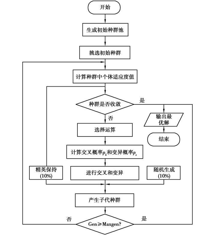 式中:f为个体的适应度值,fmax为群体中最大适应度值,fmin为群体中最小适应度值,favg为群体平均适应度值,其中pk1>pk2>pk3∈(0, 1),pz1>pz2>pz3∈(0, 1)。