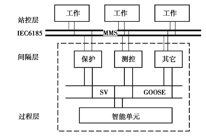 1 相关工作 1.1 智能变电站网络在智能变电站中,根据IEC61850标准主要采用的是“三层两网”的架构体系[3],如图 1所示。