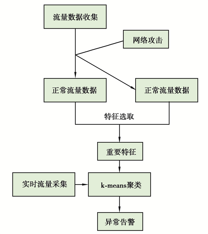 对异常流量数据进行检测的过程如图 3所示,分别是对流量数据进行收集,包括正常流量数据和经过人为干涉后所产生的异常流量数据。对收集到的流量利用2.1.2的特征选择的方法找到主要的重要特征,并将特征进行标准化处理,并利用聚类算法对流量进行分类,从而达到识别检测异常流量的效果。