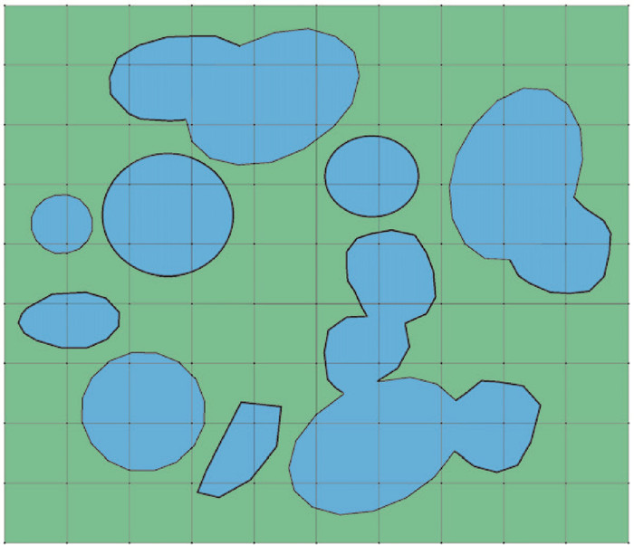 图 1 页岩中流体微结构的分布情况(蓝色代表流体,绿色代表页岩) Fig. 1 Distribution of fluid microstructure in shale (blue represents fluid, and green represents shale) |