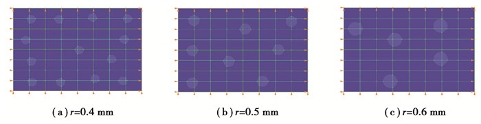 8 mm×12 mm的长方形上分布有若干圆形含水孔。边界条件为:上下两侧约束y方向位移,左侧约束x方向位移,右侧给定一个0.3 μm的方向向右的位移。单元模型一共64个单元,外边界含81个节点,流固交界面上有4个节点。单元最大边数为6,最大内边数为7。保持孔体分比都为7%,孔的半径r为0.4, 0.5, 0.6 mm(单元模型如图 10所示)。