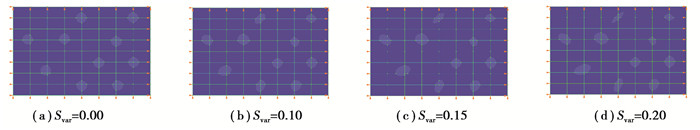 8 mm×12 mm的长方形上分布有10个含水孔。边界条件为:上下两侧约束y方向位移,左侧约束x方向位移,右侧给定一个0. 3 μm的方向向右的位移。单元模型一共64个单元,外边界含81个节点,流固交界面上有4个节点。单元最大边数为6,最大内边数为6。形状改变方差控制了孔的长短轴,长短轴的取值符合正态分布式38。当Svar为0时,孔的长短轴相等,孔呈圆形。当Svar值增大时,保持其他控制参数不变,形状改变方差Svar分别为0.00、0.10、0.15和0.20。形状改变方差越大,孔越扁平,当它为0时,孔为圆形。