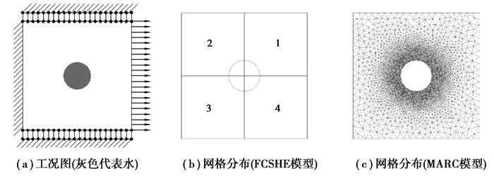 2 算例 2.1 验证模型在此算例中,建立了一个带孔的正方形板模型,分析了其在平面应力状态下的线弹性静力学行为。正方形板边长为0.40 mm,在其中心有一个半径为0.05 mm的孔,并充满了水(不考虑流动)。由于MARC软件中没有液体单元,因此通过在孔中施加压力(从FCSHE获取)来表示含水孔。FCSHE模型由4个单元组成,MARC模型由11 482个单元组成。边界条件如图 3(a)所示,水平位移为0.15 μm。在模型仿真分析中使用的材料属性如下: