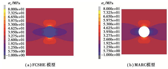 图 4 FCSHE(a)和MARC(b)的应力在x方向上的应力分量云图 Fig. 4 Contour plots of stress x of FCSHE (a) and MARC (b) |