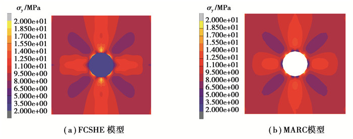 图 5 FCSHE(a)和MARC(b)的应力在y方向上的应力分量云图 Fig. 5 Contour plots of stress y of FCSHE (a) and MARC (b) |