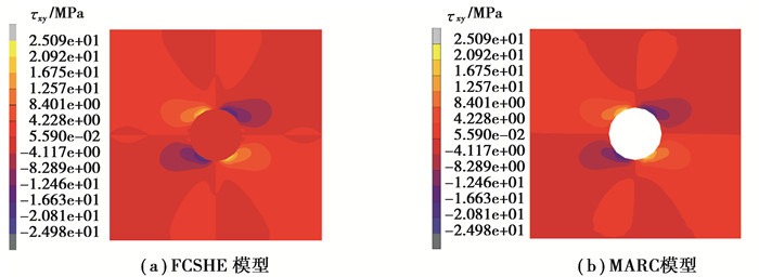 图 6 FCSHE(a)和MARC(b)的切应力的应力云图 Fig. 6 Contour plots of shear stress xy of FCSHE (a) and MARC (b) |