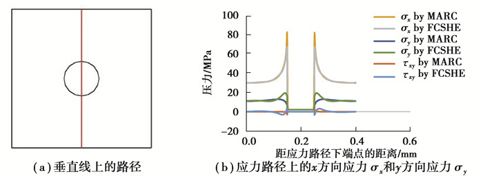 由于没有流固耦合材料的解析解,所以采用与MARC结果作对比的形式来验证有效性。图 3中的3幅图分别是工况图(a)、由FCSHE和MARC得到的模型(b)和(c),图 4~6为FCSHE和MARC分别得到的σx、σy和τxy应力云图。一条线上的路径和结果显示在图 7中。比较结果发现,尽管存在一些细微的差异,应力的总体分布、应力集中的位置以及应力场值的趋势都非常相似,而且应力集中出现在流固交界面的上下两侧,不同于固体材料的左右两侧。