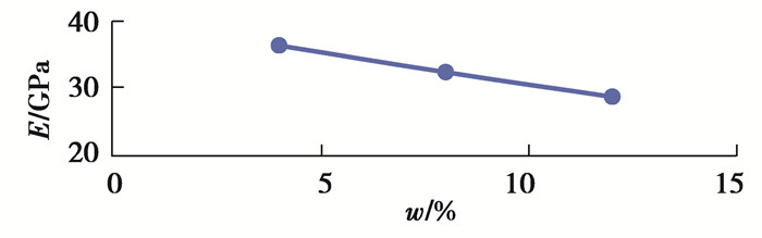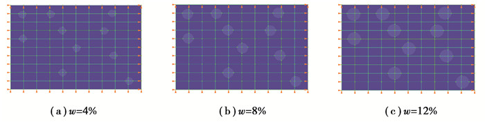 2.2 等效弹性模量的影响因素 2.2.1 体分比对等效弹性模量的影响在8 mm×12 mm的长方形上建立模型,其上分布有10个含水孔。边界条件为:上下两侧约束y方向位移,左侧约束x方向位移,右侧给定一个0. 3 μm的方向向右的位移。模型一共100个单元,外边界含121个节点,流固交界面的边界包含4个节点。含水孔体分比w分别为4%、8%、12%。在模拟分析中所用材料的弹性模量和泊松比与模型验证中所用材料相同。