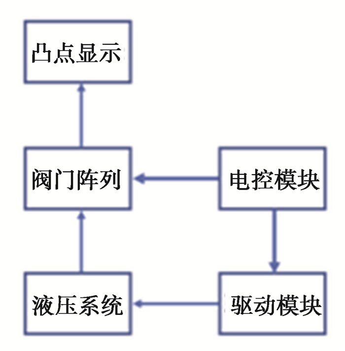 1 数学模型建立文中所用的盲文显示器实验装置如图 1所示,通过对系统功能划分,将整套装置可简化为如图 2所示的功能模块框架图;盲文显示器主要由凸点显示模块、阀门阵列模块、液压模块、电控模块、驱动模块5个部分组成。