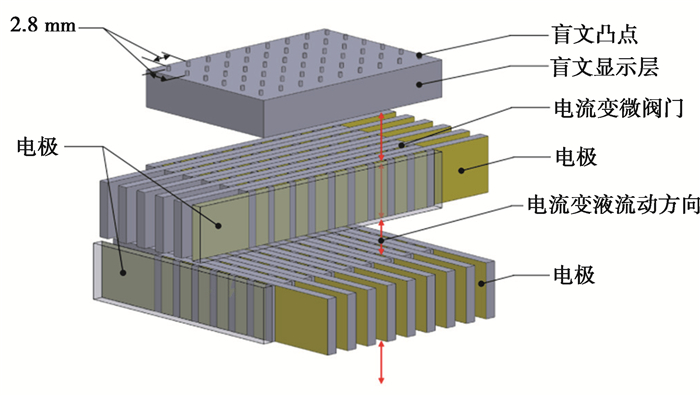 阀门阵列及盲文显示层结构如图 3所示。盲文凸点工作流程为:当电极不施加电压时,微阀门处于非工作状态,即电流变液在微阀门内处于零场状态时,如图中红色箭头所示,电流变液在两层微阀门阵列中自由流动,盲文凸点处于可上下运动状态;当电极施加一定的电压,电流变微阀门处于工作状态时,电流变液在两电极所形成的电场作用下发生变性,微阀门起到阻止电流变液通过的作用,盲文凸点不动作。