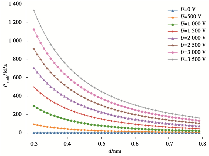 根据极性分子型电流变液所测得的相关属性,在阀门两端施加不同大小的电压U时,电流变液的剪切应力τERF也会随之改变。通过理论分析,结果如图 5所示,当阀门间隙d恒定时,随着施加电压U的增大,阀门静态压差ΔPstatic也随之增大。设微阀门流道长度l为恒值,当U=0 V时,Pstatic会保持一个较小的值线性增长,且增长的趋势极为平缓;Pstatic会随着施加电压U的增大而增大,但由于电流变液的耐压限制,施加电压U应控制在所选介质耐压值之内。