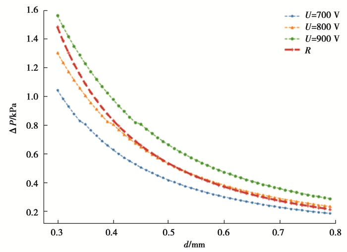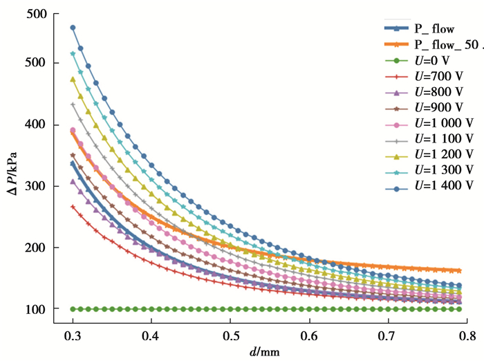 为了满足盲文显示器的工作稳定性,微阀门的静态压差应大于动态压差,即Pstatic>Pflow,如图 6所示,通过理论分析计算,对于所使用的这款极性分子型电流变液而言,当施加电压U>800 V时,满足盲文显示器的稳定性需求,但实际设计上,应该留出一定的裕量,文中留出50 kPa的裕量后,施加电压U>1 000 V,且阀门间隙d < 0.4 mm时,能满足稳定性需求。故为了保证微阀门可以长期稳定工作,施加电压U应大于1 000 V,且施加电压U越大,临界工作点越靠右,阀门间隙d的控制范围越广,但由于施加电压过大,所需的开关控制器件体积越大,盲文显示器的便携性下降,不利于盲人的使用。若微阀门在相同条件下可以提供更高的剪切应力,那么在相同施加电压下,临界工作点将右移,提升系统可控性。