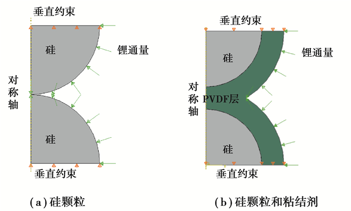 3 硅颗粒和粘结剂在充电和放电过程的有限元模拟为了计算复合硅电极颗粒和粘结剂在充放电循环过程中的应力,不考虑硅颗粒因膨胀、收缩产生的应力而引起锂的不均匀扩散。假定粘结剂层均匀的分布在2个活性颗粒之间;影响锂扩散的因素只有锂离子浓度,在锂浓度梯度的作用下锂离子自由扩散,取扩散常数[26]D=10-16(m2·s-1);由于实际中的粘结剂往往添加了诸如乙炔黑的导电添加剂,并且被电解液浸泡,因此认为粘结剂是良好的锂离子导体,即锂离子通过粘结剂层完全没有阻碍,即颗粒表面的锂离子浓度与粘结剂外表层的锂离子浓度相同。建立如图 1所示的轴对称有限元模型。选取活性颗粒半径[31]为R=100 nm,粘结剂层厚40 nm,计算恒定通量锂离子扩散情况。
