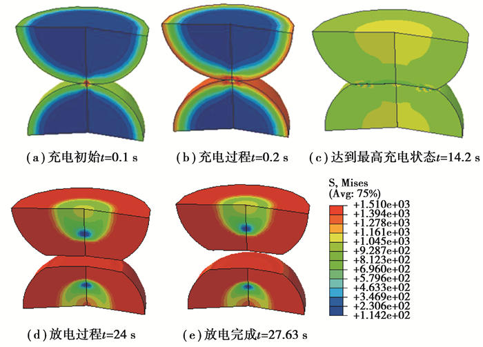 图 2 第一次充电放电循环中活性颗粒经历的应力变化云图 Fig. 2 Cloud diagram of stress change experienced by active particles in the first charge discharge cycle |