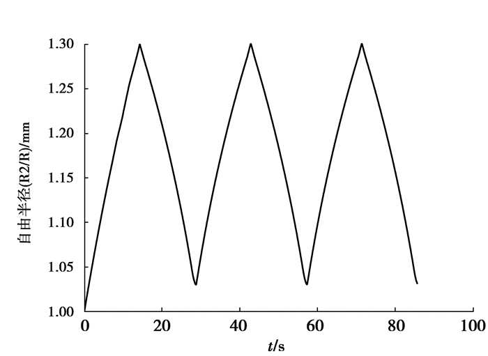 图 3 颗粒自由端半径R1在3次充电放电循环中的变化 Fig. 3 Variation of particle free end radius R1 in three charge discharge cycles |