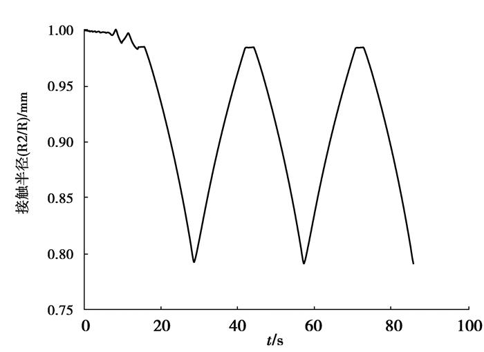 当2颗粒相互挤压应力超过屈服应力时,两活性硅颗粒便会发生永久的塑性变形如图 2(c)、(d)、(e)。充电前自由端半径R1、接触半径R2与粒子的初始半径R相等,随着充电过程进行硅颗粒的自由端半径R1膨胀,而接触半径由于颗粒接触界面的存在基本保持不变,见图 3和图 4所示。多次循环中的2颗粒间最大的接触应力发生在第一个循环中,随后循环中的最大接触应力较第一次循环小,见图 5所示,随着锂浓度引起的颗粒膨胀变化导致颗粒间相互作用的接触应力变化,在第一次充电过程中锂浓度增加使膨胀颗粒相互挤压加剧,接触应力表现为急剧升高达到峰值,接触应力超过屈服应力后会发生硅颗粒永久塑性变形,产生能量损耗;随着放电过程锂浓度的下降,接触应力降低,当相互挤压的硅颗粒脱离接触时,接触应力迅速下降,因此锂电池的第一次充电过程是最危险的过程,在第一次充电过程的硅颗粒模型里硅的相互挤压产生的很大接触应力会引起整个电极乃至整个锂电池都会产生大应力,这极易引发活性颗粒的粉碎性破裂,造成锂电池的失效。巨大的塑性应变不仅会使电池容量造成损失,还可能会造成电池内阻增大,枝晶析出等一系列问题。