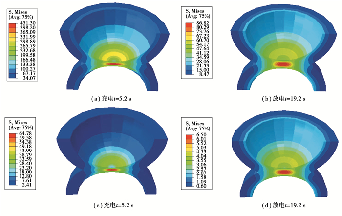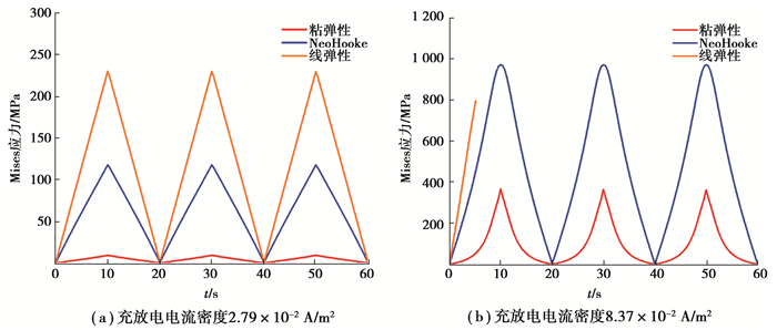 从图 6粘结层接触应力的结果可以看出,3种流变模型中线弹性模型的应力变化很大,Neo-Hooke超弹性模型得到的应力变化次之,粘弹性模型得到的应力变化最小。从图 6(a)可以看到充电过程t=5 s时,线弹性本构方程计算得到的Mises应力约是超弹性本构方程结果的2倍,可见选用不同的本构方程对应力预测会产生很大的影响,采用符合粘合剂流变行为的本构方程很重要,图 6中粘弹性模型得到的应力变化小,其大小量级与实验结果相符[23],因此选用粘弹性模型描述PVDF粘结剂的流变行为比较符合实际,即形变较大时采用粘弹性本构方程比采用适于小形变的线弹性本构方程更合理。粘弹模流变类粘结剂承受的应力小于超弹性类和线弹类流变行为的粘结剂,这一点可供锂电池粘结剂选择时参考。
