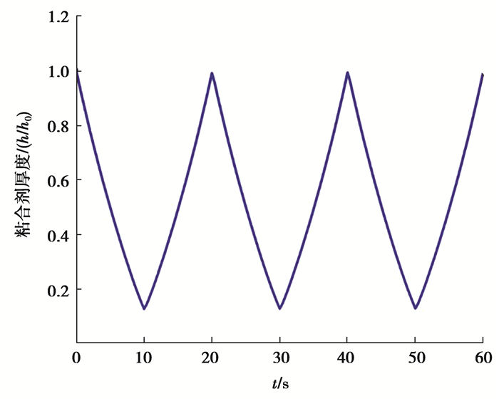 粘结剂含量是电池生产中1个重要参量,优化粘结剂含量会延长电池的使用年限。表 2表示的是电流密度2.79×10-2A/m2下不同PVDF粘结剂层厚度40 nm、50 nm、60 nm、70 nm、80 nm时,即不同粘结剂含量时粘结剂最大接触应力,最大的接触应力仍然发生在充放电循环的第一次充电过程中。可以看出,随着粘结剂层厚度的增加,粘结层界面的最大应力逐渐降低,但应力降低幅却逐渐减小。由于粘结剂为非活性材料,会降低电池的总容量,所以在不引起电池重量增加总容量减下的前提下,可适当增加粘结剂厚度来降低相应的应力,避免机械失效。
