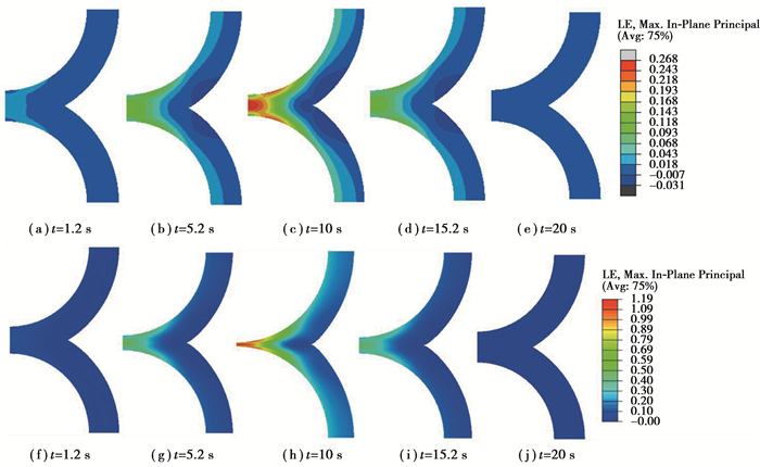 从图 7、图 8可以看出硅的平均锂化程度C=0.083时,充电使粘结剂层经历较大的变形,粘结层的压缩量近80%,从而使粘结剂层出现了较大的应力,并且在靠近底部接触点附近的圆环形区域产生的应力和应变大于底部接触中心点的应力和应变,见图 8和9(c)和(h)t=10 s,计算结果可以解释粘结剂先从最大环状应变位置开始脱落的原因。如果粘结剂的弹性小,就会在粘结剂/硅界面处产生很大的接触应力,影响粘结剂和硅颗粒间界面机械损伤性能,可见粘结剂的性能对界面应力有显著影响,无疑力学性能优良的粘结剂是锂电池技术进步所需的。