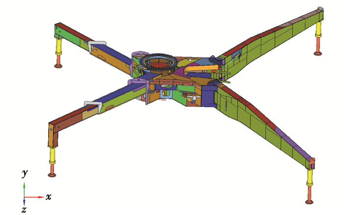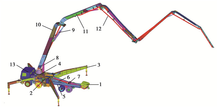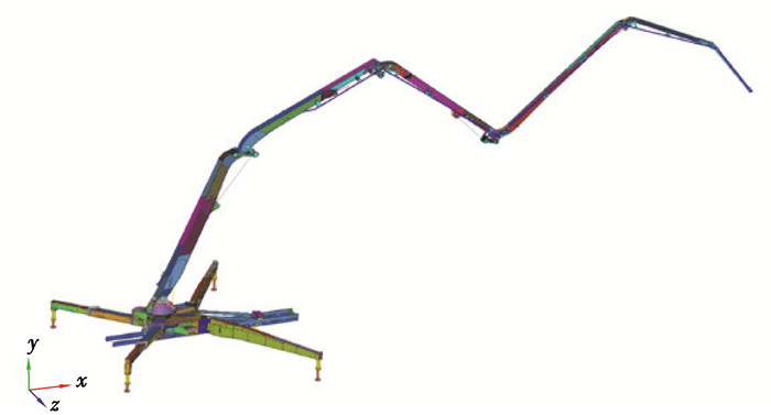 4) 混凝土泵车整机有限元模型。将已建立的底架系统、臂架系统、底盘及混凝土泵等三大子系统有限元模型进行组装,完成混凝土泵车整机有限元模型的建立。通过刚性耦合单元RBE2模拟底架系统与底盘及混凝土泵的螺栓固定连接,采用MPC多面约束方程耦合臂架根部转台与底架顶部圆筒顶面,以模拟臂架系统与底架系统之间的连接,以此方式实现混凝土泵车有限元模型的整机装配,整机有限元模型如图 5所示。