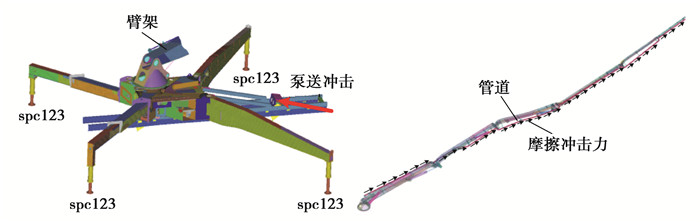 设置整机有限元瞬态分析边界条件时,将4条支腿底端约束X/Y/Z 3个方向的平移自由度以模拟地面对4条支腿的支撑与固定关系。如图 10所示,在混凝土泵与副车连接处施加泵送冲击力,在臂架管道上施加混凝土摩擦冲击力。泵送油缸引起的下车体振动将通过泵送反力与副车架、底盘大梁以及被悬挂的汽车底盘的相互作用被模拟出,并且由此引起的车体振动及臂架振动影响将直接被包含在仿真结果中。