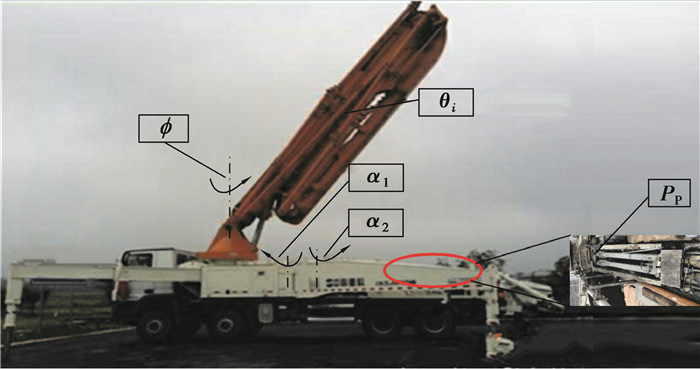3.1 实验测试 3.1.1 整机位姿与泵送油压测试实验中以某型52 m 6节臂混凝土泵车为测试对象,该车自带随车智能监测平台,可以实时监测显示并记录各监测量的变化,监测平台测试项目如图 11所示。Pp是混凝土泵车的混凝土泵供油路油压,α1与α2分别是混凝土泵车左后支腿与右后支腿的展开角度,ϕ是臂架底部转台的转动角度,θi(i=1, 2,…,6)是6节杆臂的倾角。