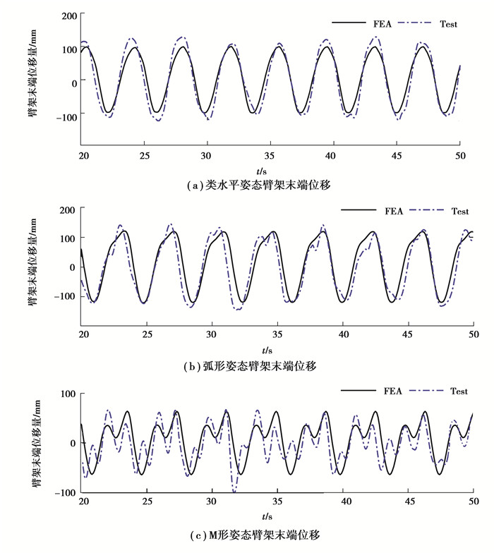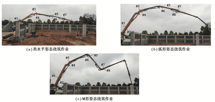 3.2 测试结果及对比 3.2.1 整机位姿与泵送油压测试结果由于实验场地限制,测试时,混凝土泵车的左后支腿未完全展开,右后支腿和前支腿完全伸展到极限位置。3种测试姿态下,转台转角位置略有不同,实验场地有砖墙,导致3种姿态的第1节臂都有较大角度地抬起。3种测试姿态如图 14所示,依据泵车姿态将其命名为类水平姿态、弧形姿态和M形姿态。